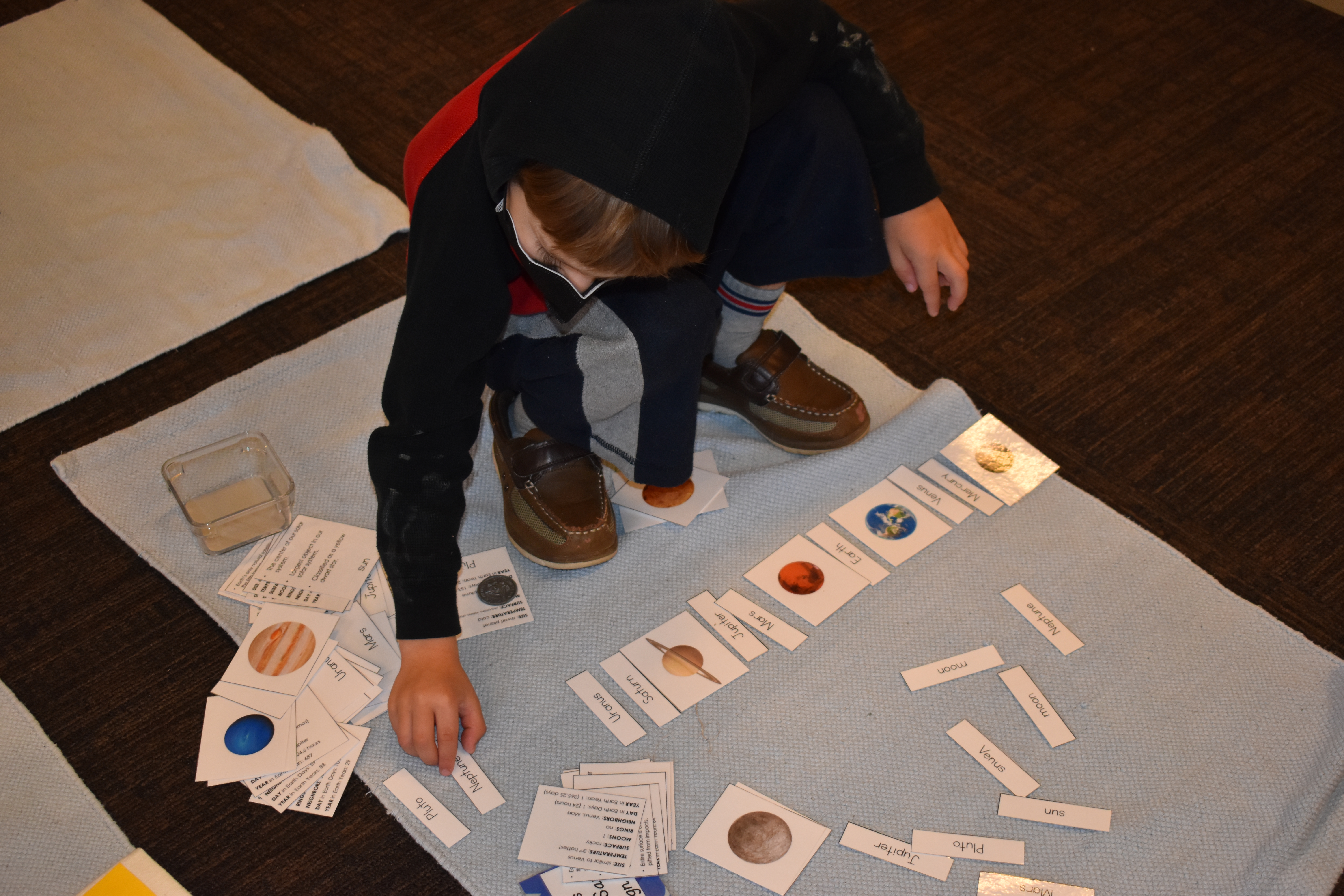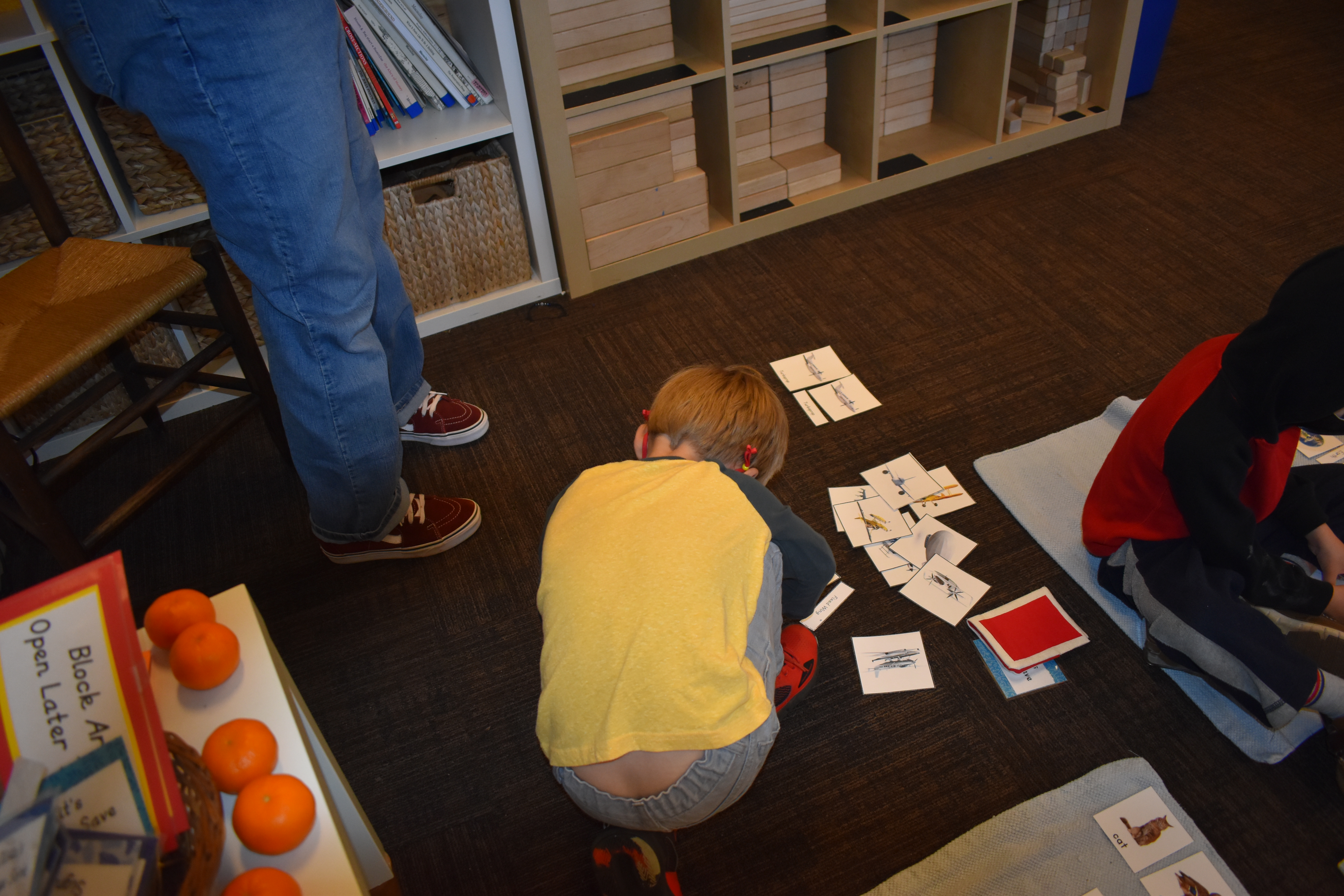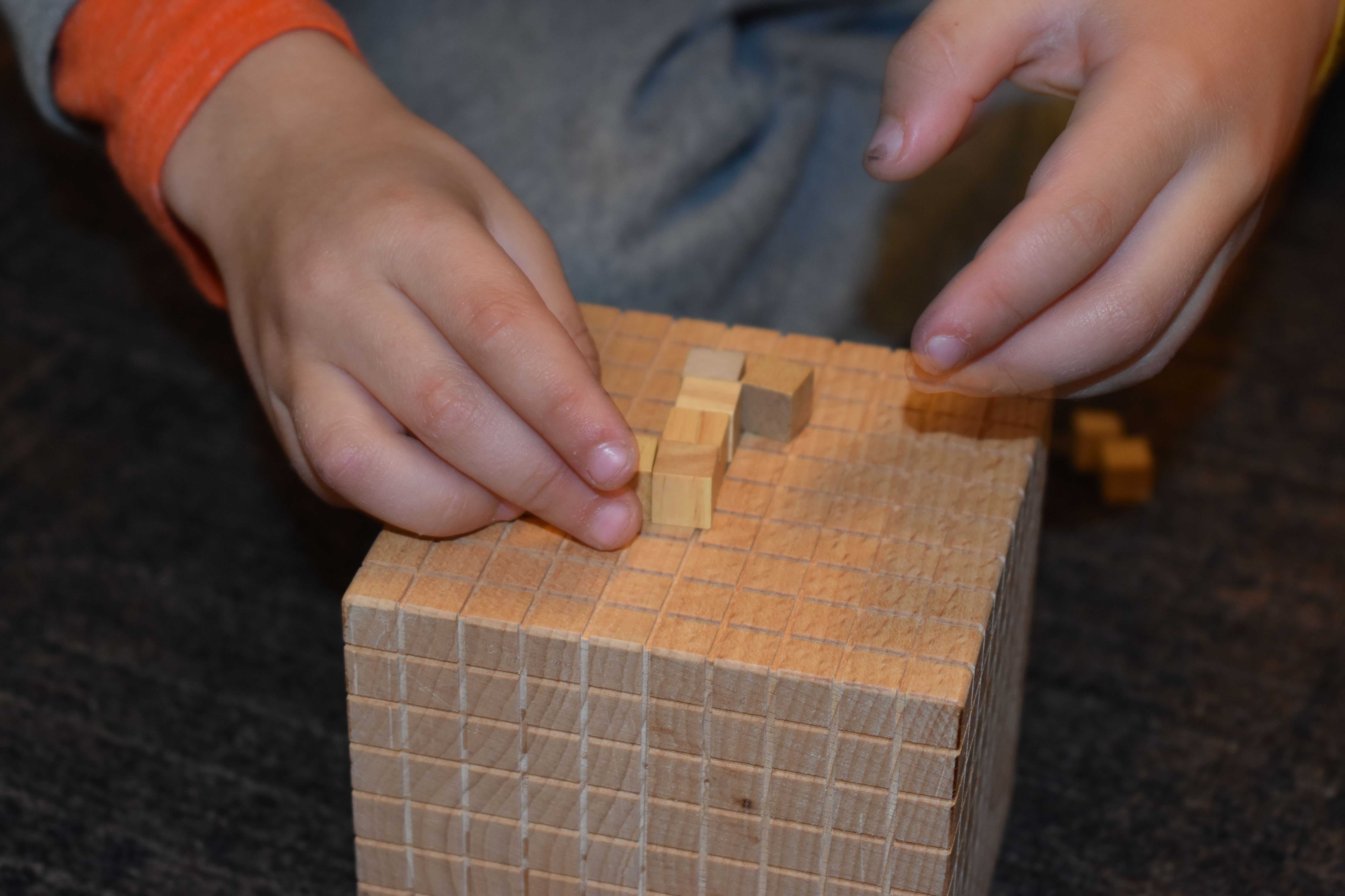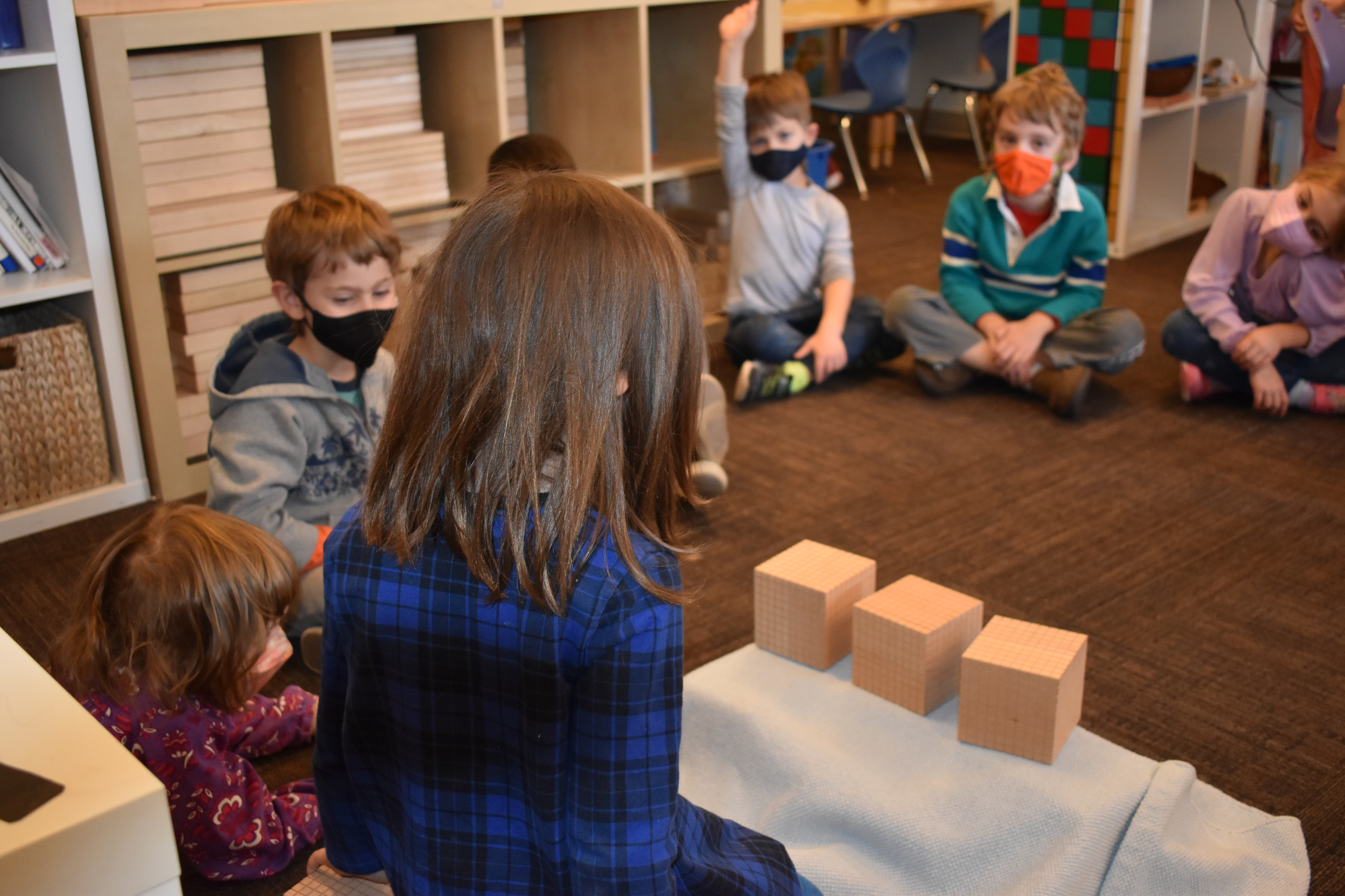 The best part of having students for 2 to 3 years is that the older students learn how to demonstrate activities, and to support their younger classmates understand material. In this way the older students re-learn and solidify their understanding across the curriculum. This week there was a demonstration of “What is Under the Rug?” a game in which ten unit blocks (1’s) are counted out and then some are hidden under the rug. If 4 are shown, students make guesses about what is underneath. They are getting very skilled with equations that equal ten! The student then played the same game using 10’s, 100’s, 1,000’s!