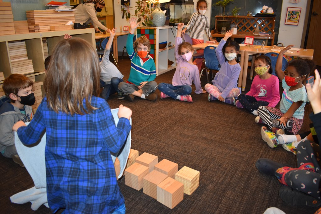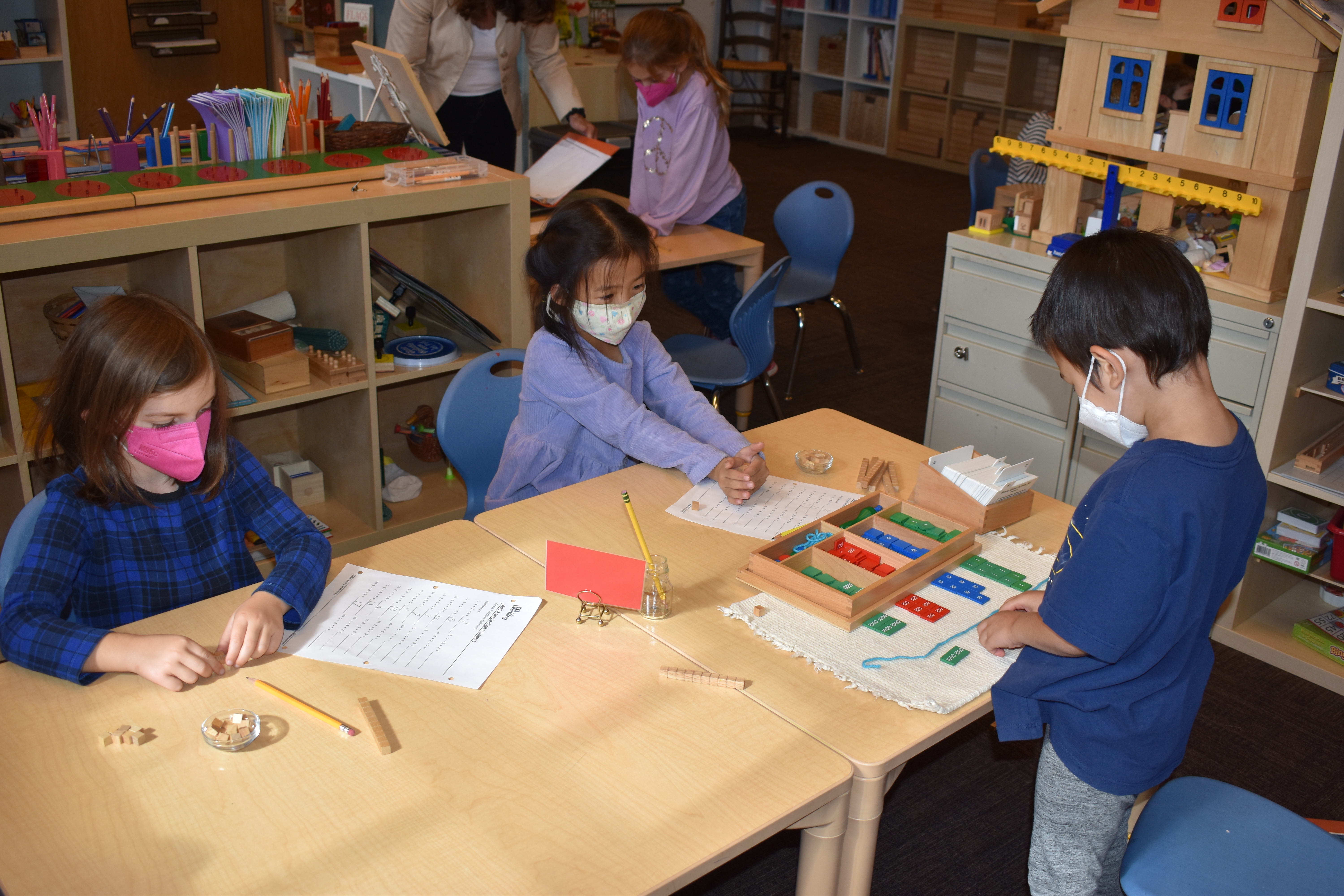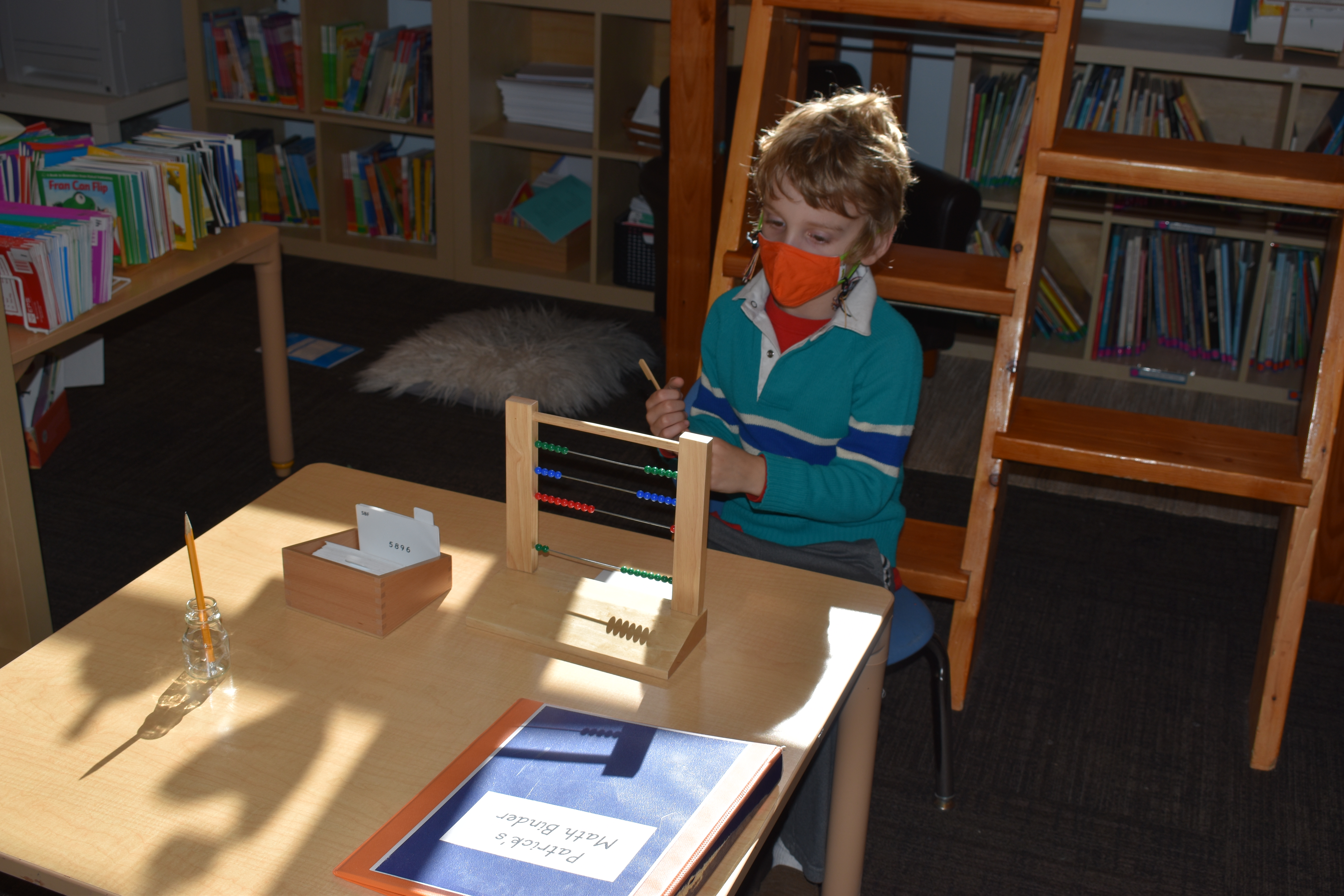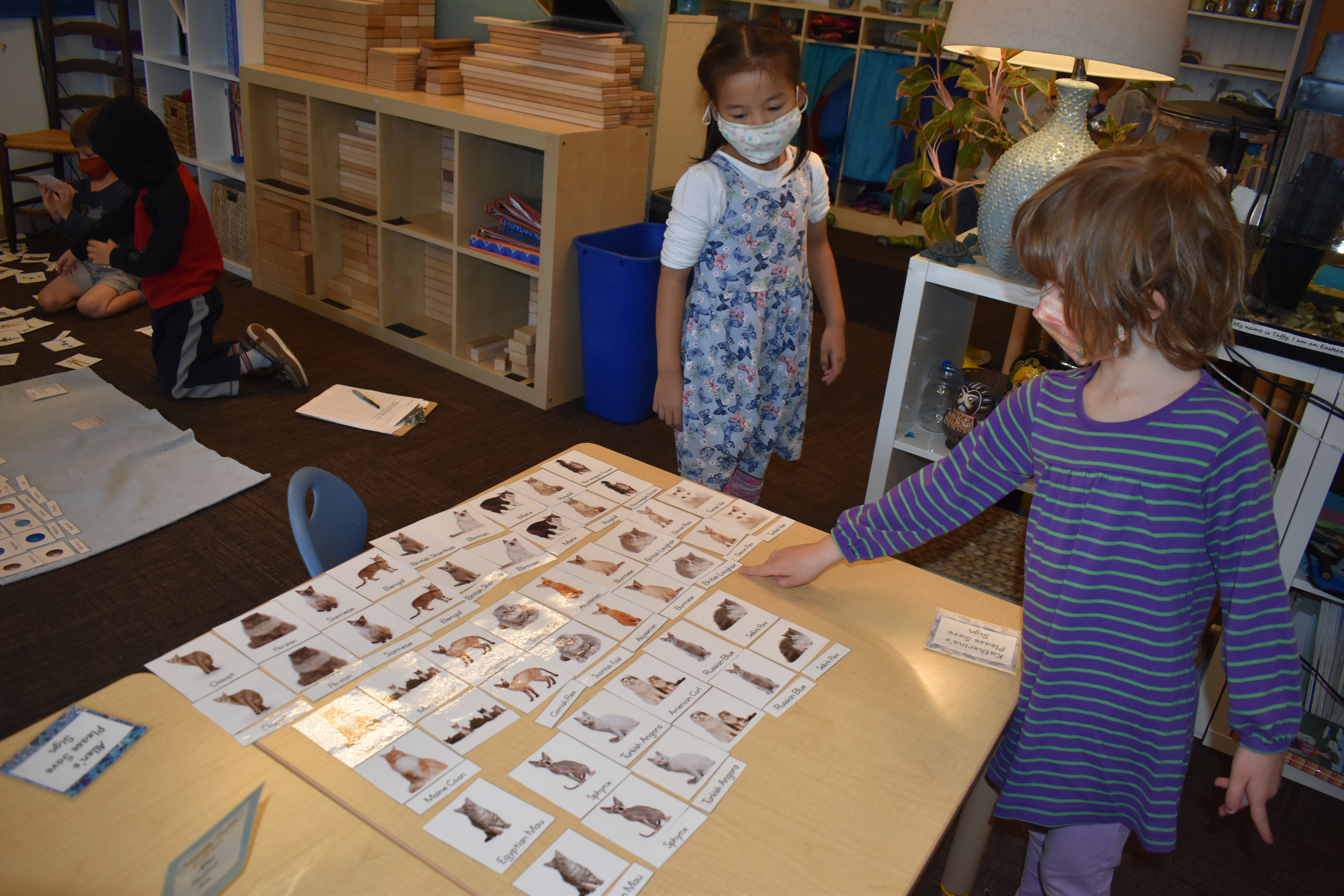 The best part of having students for 2 to 3 years is that the older students learn how to demonstrate activities, and to support their younger classmates understand material. In this way the older students re-learn and solidify their understanding across the curriculum. This week there was a demonstration of “What is Under the Rug?” a game in which ten unit blocks (1’s) are counted out and then some are hidden under the rug. If 4 are shown, students make guesses about what is underneath. They are getting very skilled with equations that equal ten! The student then played the same game using 10’s, 100’s, 1,000’s!