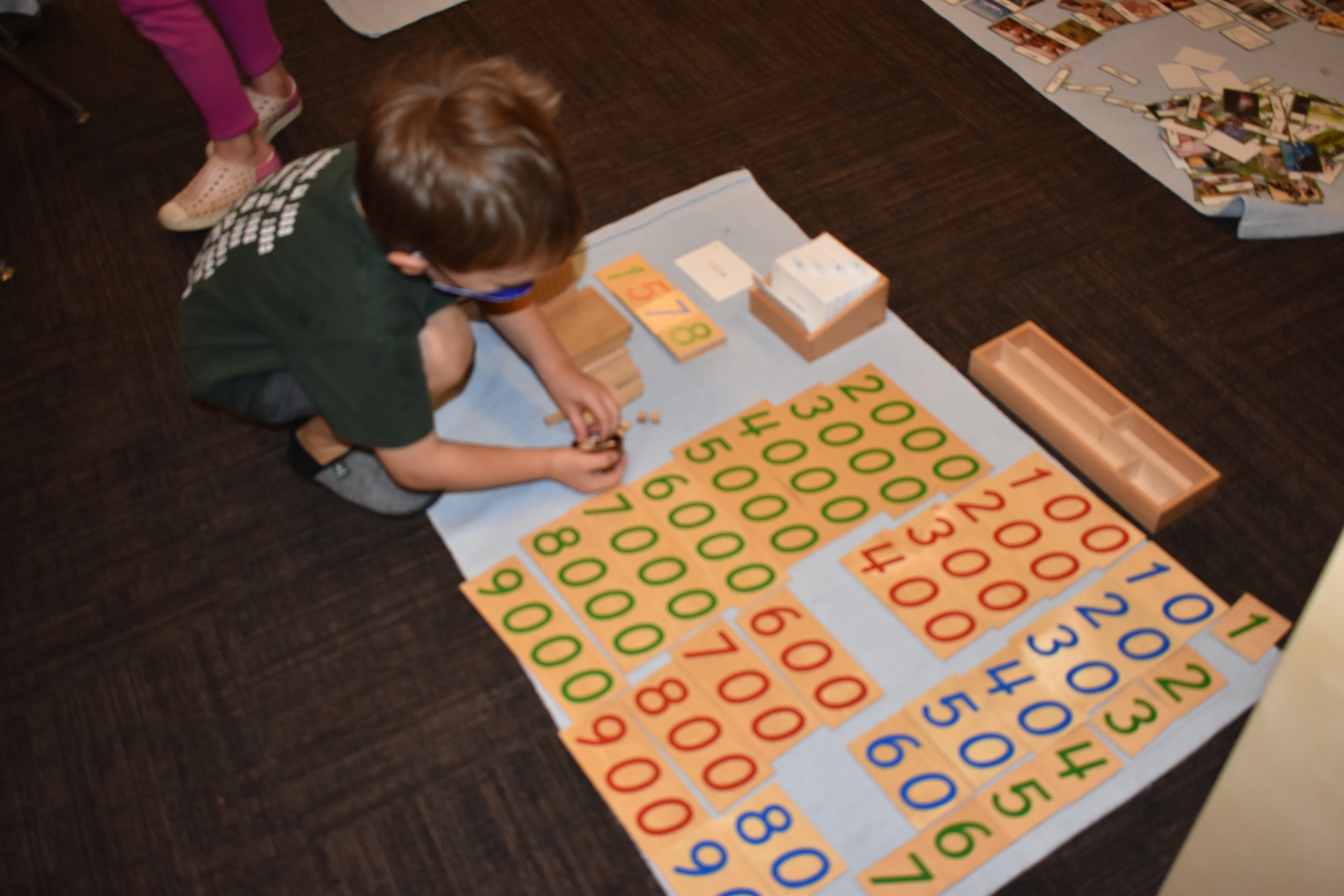After this students were divided into pairs to work in for the rest of the week. Students were introduced to new materials such as the stamp game and the small bead frame. Both materials are a hands-on activity that is accompanied by sets of cards that increase in difficulty and mathematical operations, starting with the addition of two 4-digit numbers without carrying. We continued using these materials for the rest of the week while working on our focus, cooperation, frustration levels and scribing of numbers on whiteboards with the correct place value.