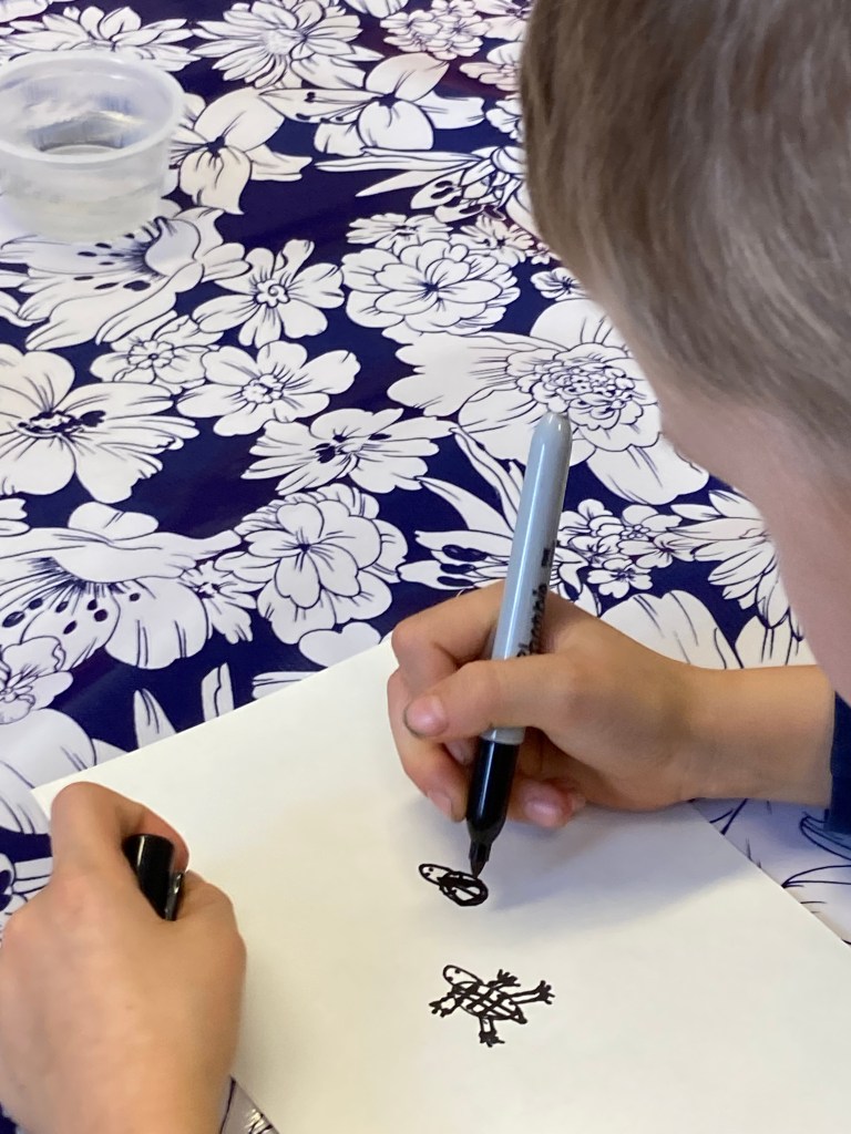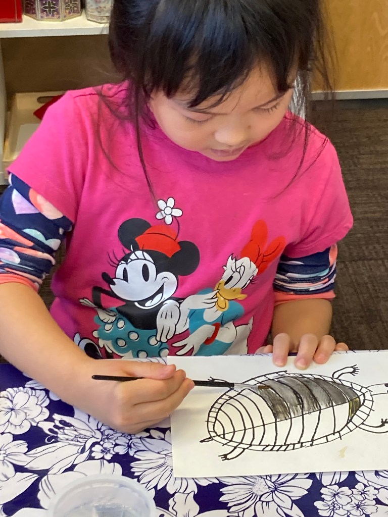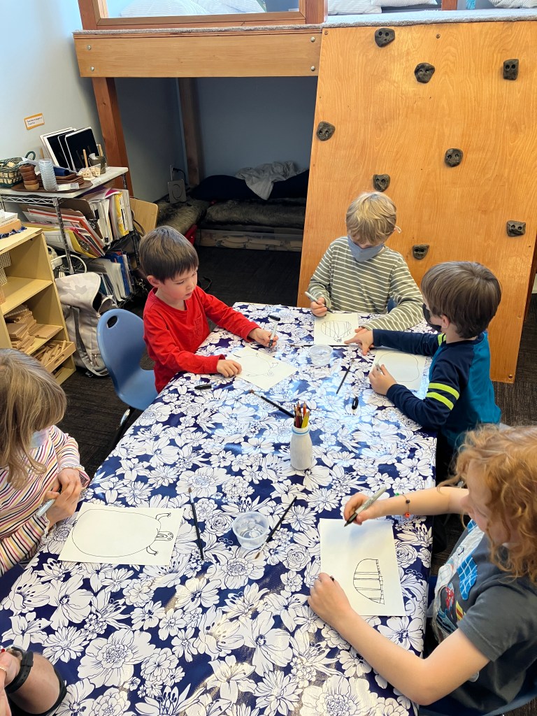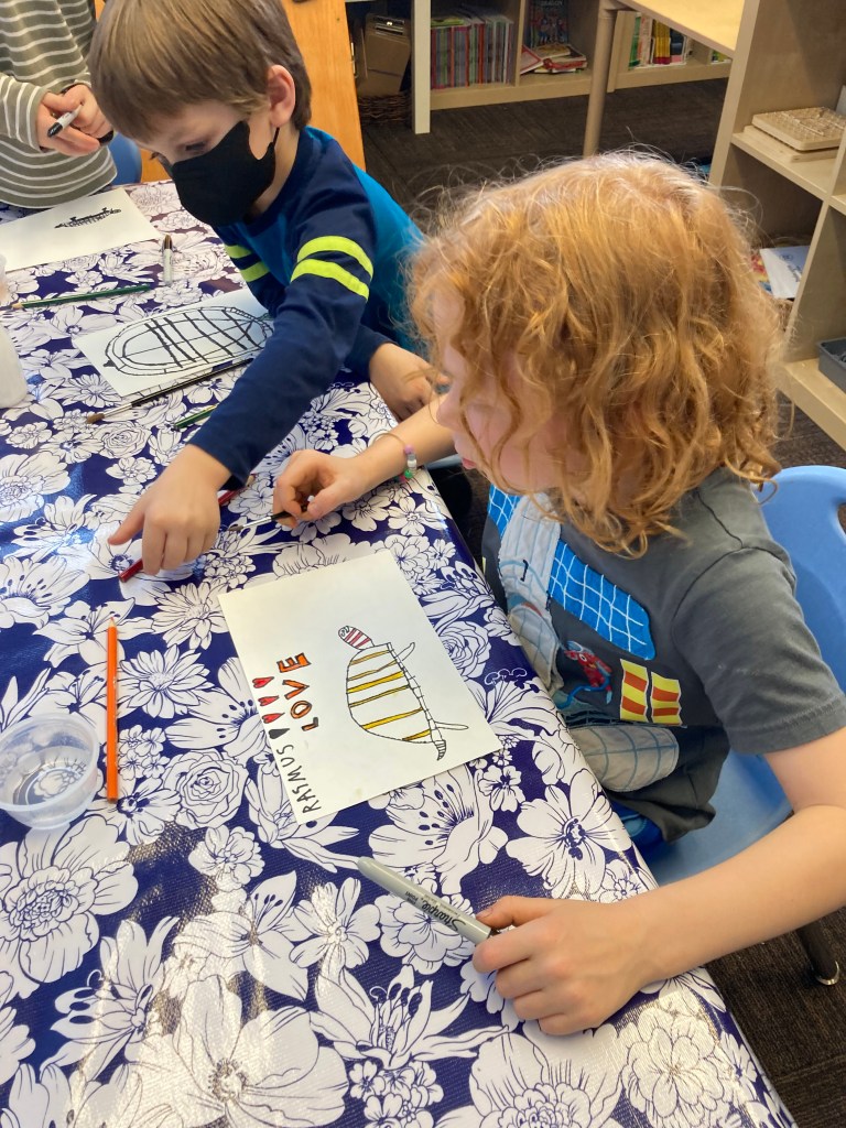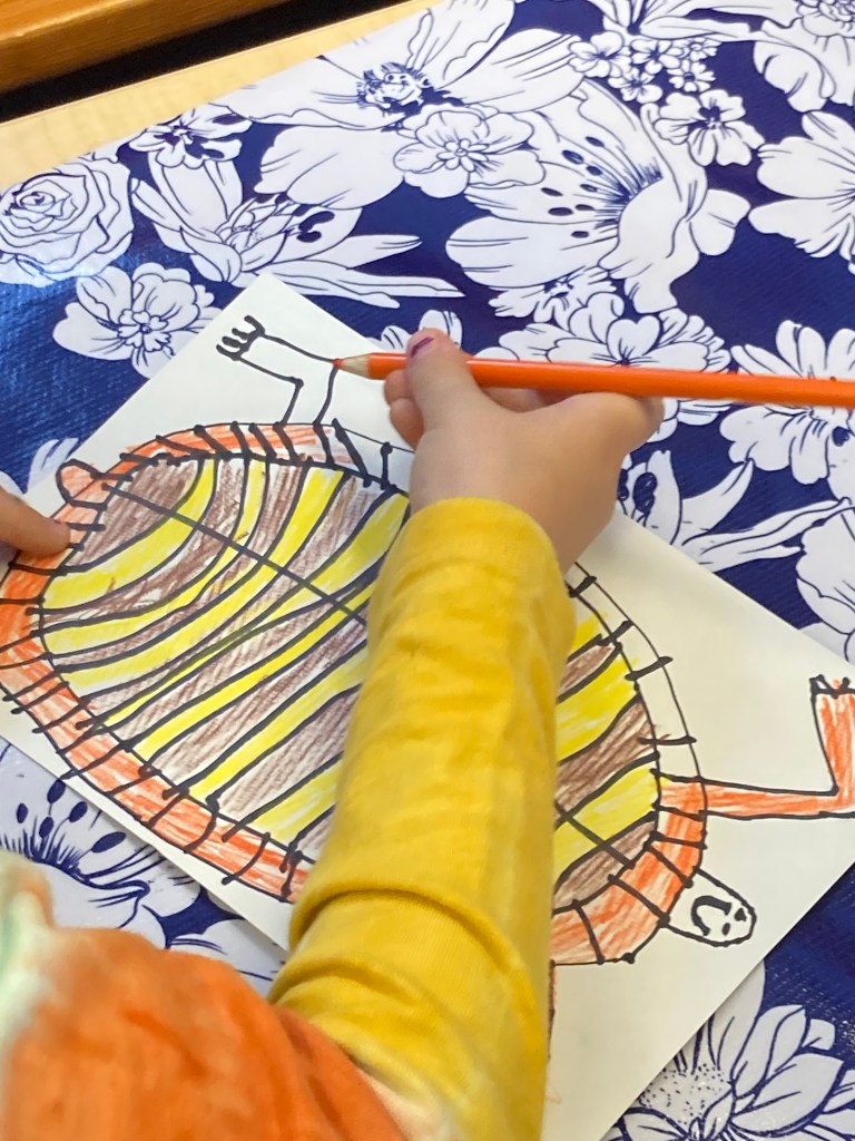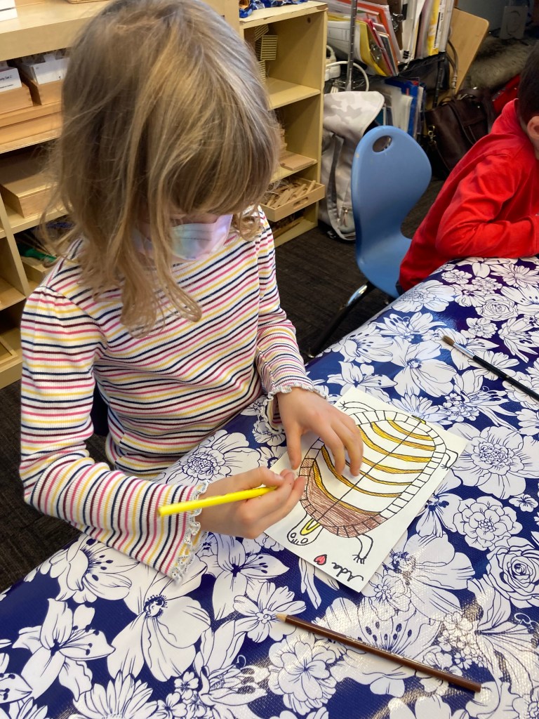First, students used a sharpie to draw their turtle. Everyone wanted to make an old turtle so they drew a lot of scoots! We then learned how to use watercolor pencils to blend the turtle’s many bright colors. The illustrations are stunning, and you are welcome to stop by and view them for yourself! They are hanging outside our classroom on the bulletin board.