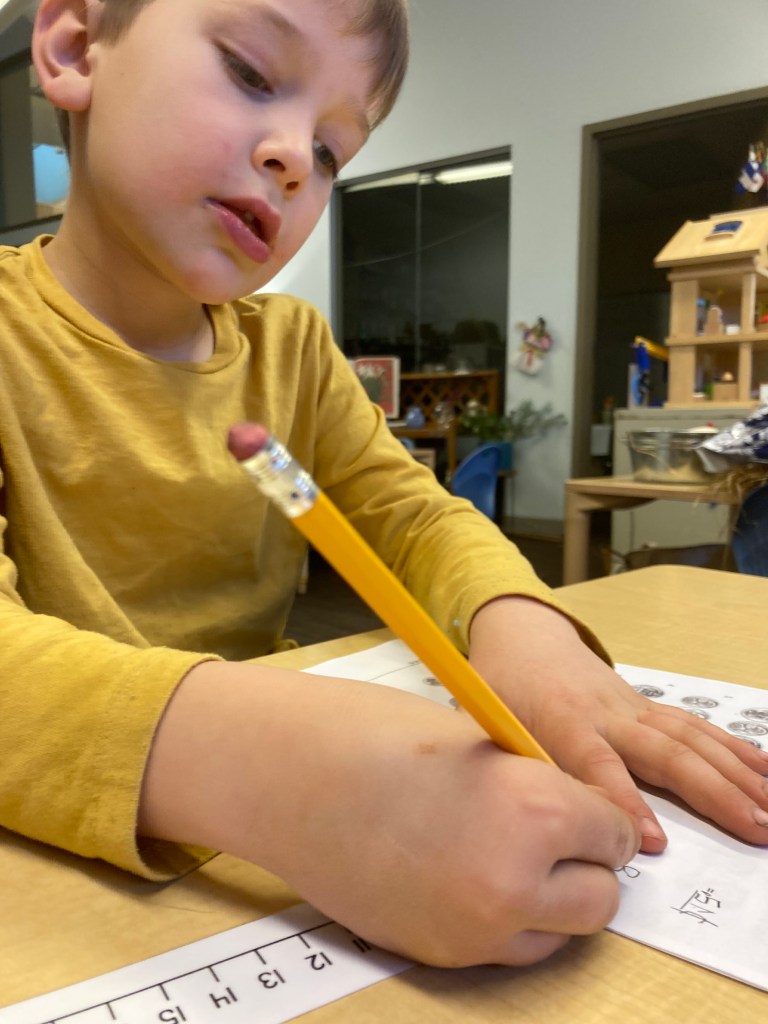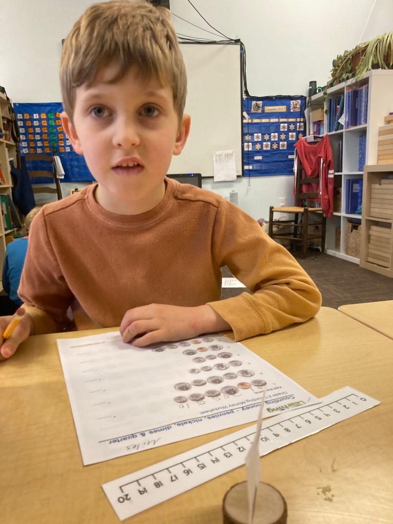 Students have been working very hard in math over the past few weeks, learning about coin identification, counting coins, adding and subtracting, and playing fun games such as the Trading Game and Top It. After spending time practicing, students created their own store, added items they were going to sell, priced them, and then visited each other’s stores to “buy” their goods. We used the “bank” to learn about trading pennies for nickels, dimes, and eventually quarters. Providing a number line also helped students with the directionality of numbers and counting. If you are looking for some fun, empty your pockets of coins and see what your student can show you!