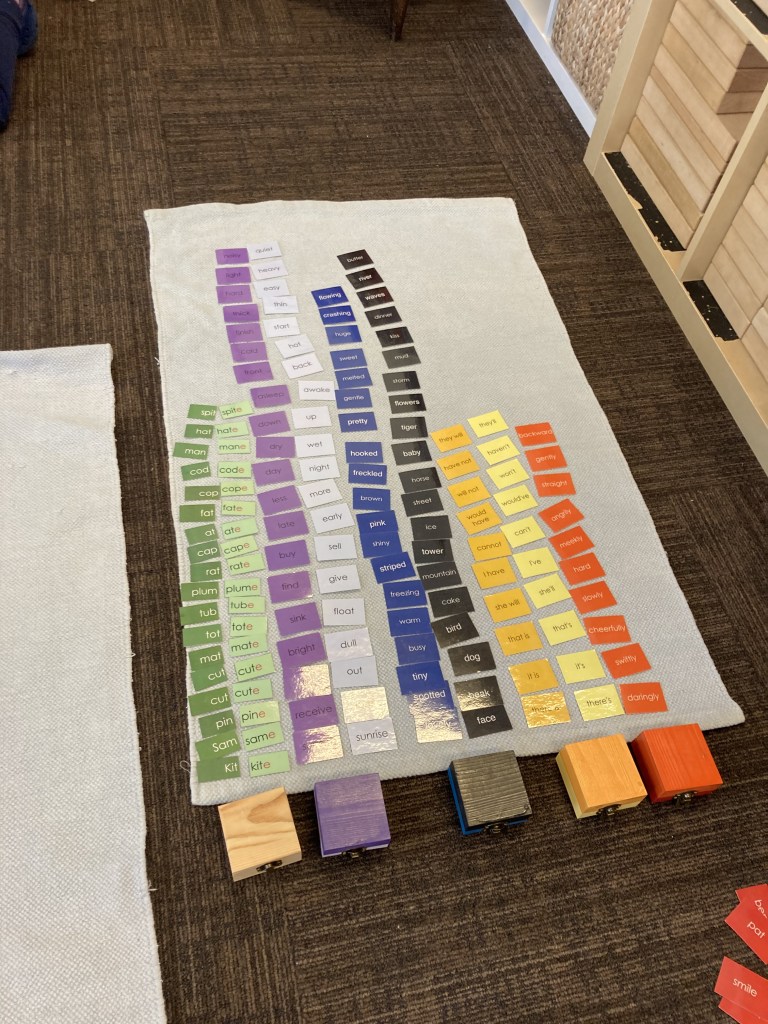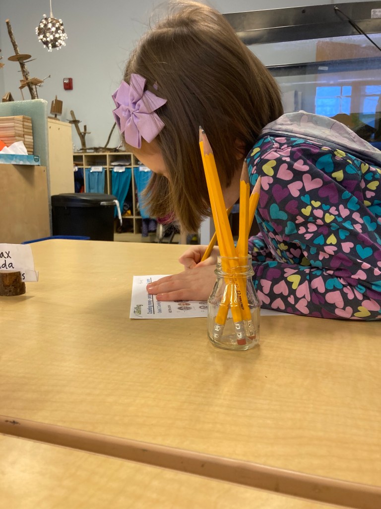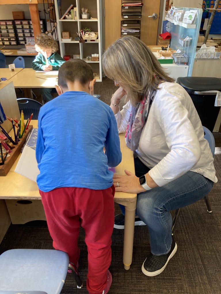 In LE, literacy is part of every single day and in many ways. Each morning in our Writer’s Workshop, we have a task based in literacy including metal insets, handwriting, vocabulary, word sorts, journaling, and grammar. In small groups, students say particular words, build the word using wooden letters in both conventional and cursive, write the word on a dry-erase board or iPad, and then use it in a sentence. They choral read, read to a teacher, and to each other. It is amazing to watch the progress as everyone’s confidence grows.