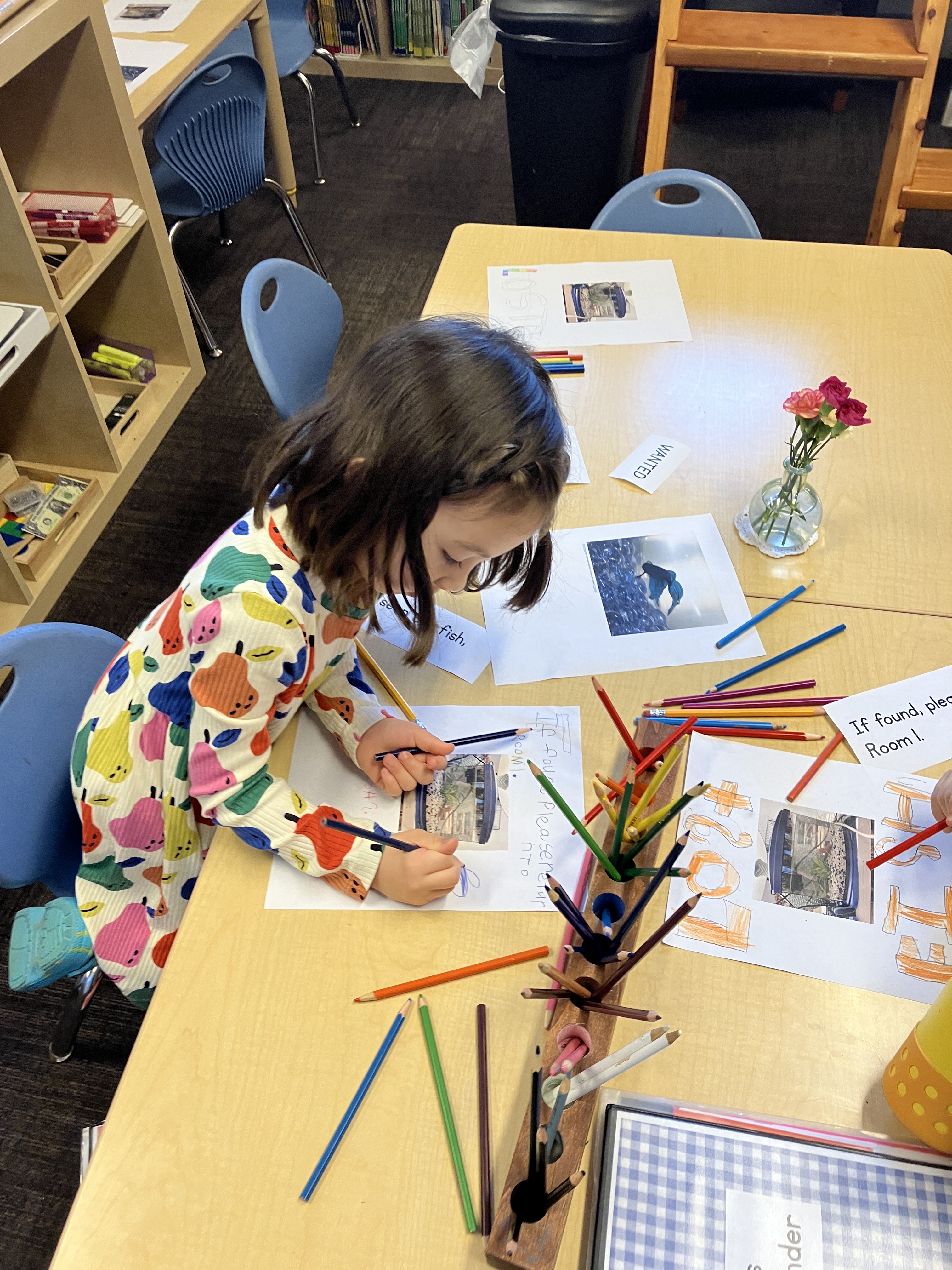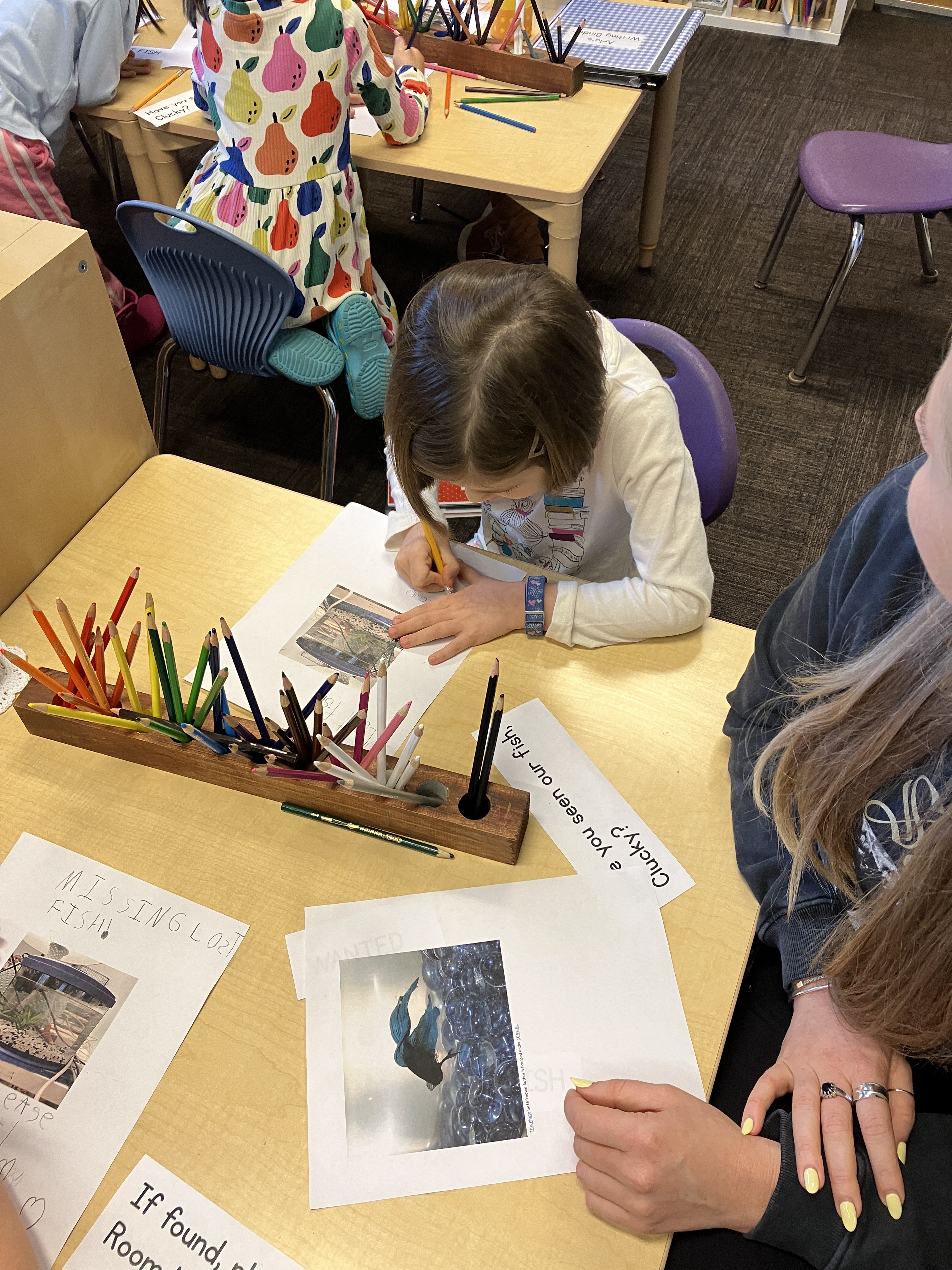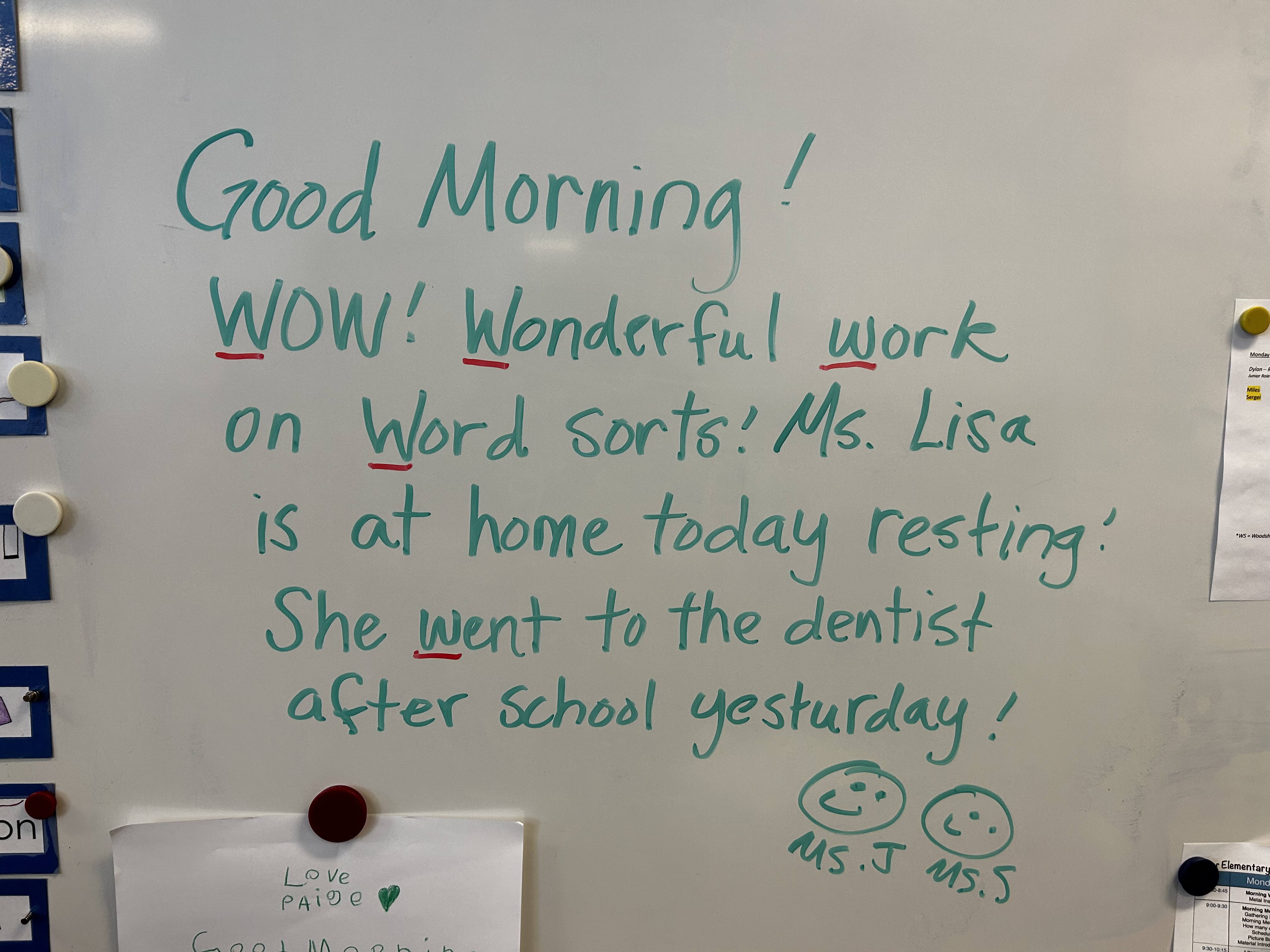 There has been a lot of discussion (still) over what happened to Clucky, our fish. As a writing prompt, students used words and sentences like “Lost”, “Missing”, “Have you see our fish?” and made a poster to hang around the school, in the hope that someone might have some information that leads to solving the mystery. A second prompt was for students to write a get well soon note to Ms. Lisa after gum surgery. When she came back to school on Thursday morning, there was a delightful pile of very thoughtful messages and beautiful illustrations with lots of hearts (her favorite thing), rainbows, waves, and vikings. She was so happy!